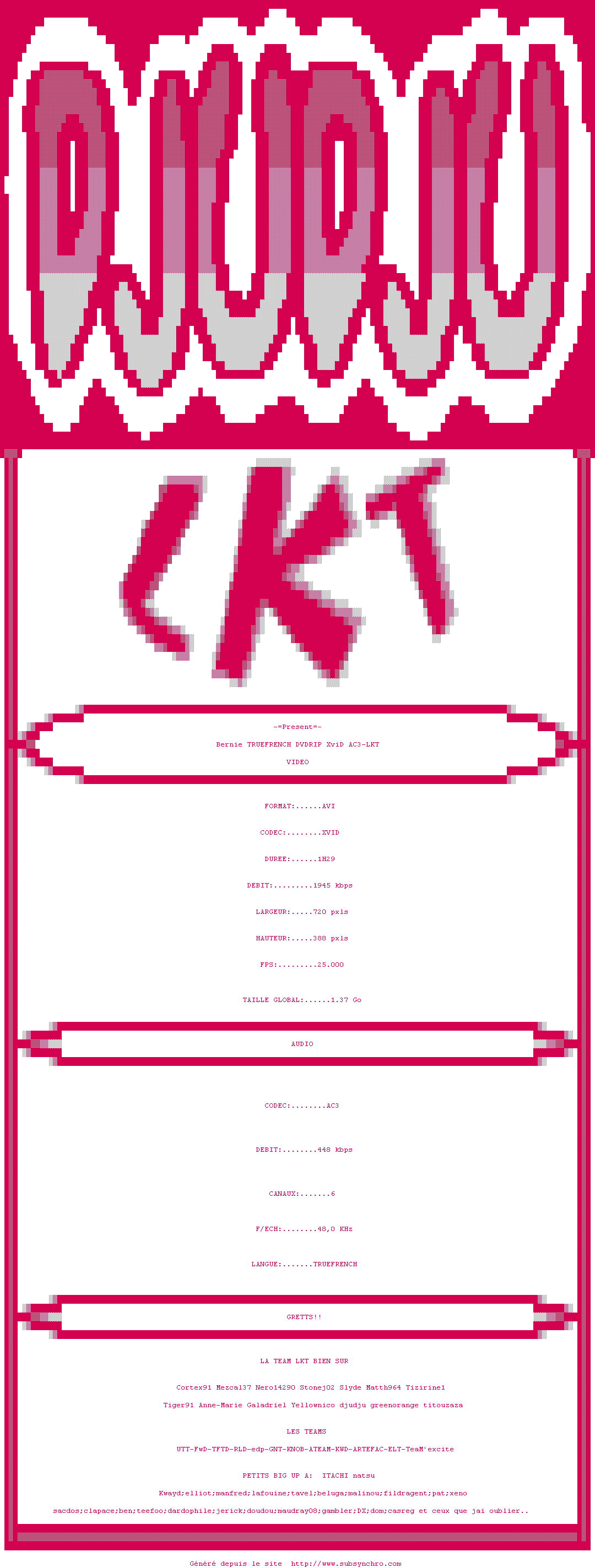 Voir le nfo de la release Bernie.TRUEFRENCH.DVDRIP.XviD.AC3-LKT