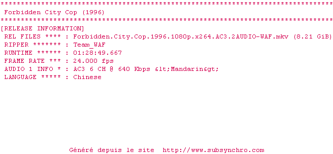 | VXT | Forbidden.City.Cop.1996.CHINESE.1080p.BluRay.H264.AAC-VXT OpenSubtitles | 0 fichier | |||