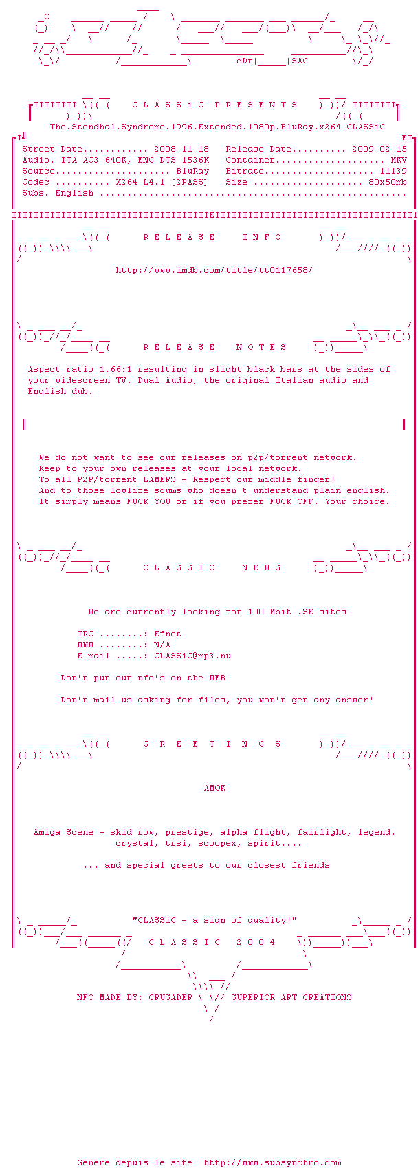 Voir le nfo de la release The.Stendhal.Syndrome.1996.Extended.1080p.BluRay.x264-CLASSiC