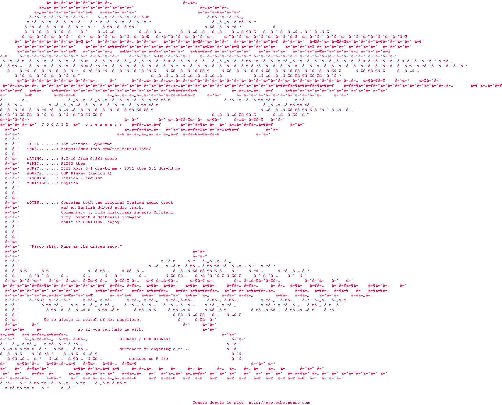 La release The.Stendhal.Syndrome.1996.2160p.UHD.BluRay.H265-COCAIN est en 4K