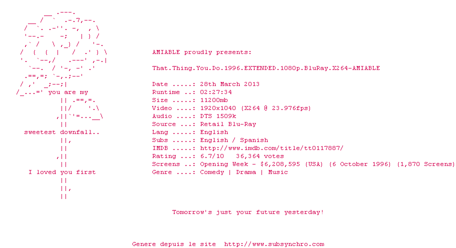 Voir le nfo de la release That.Thing.You.Do.1996.EXTENDED.720p.BluRay.X264-AMIABLE