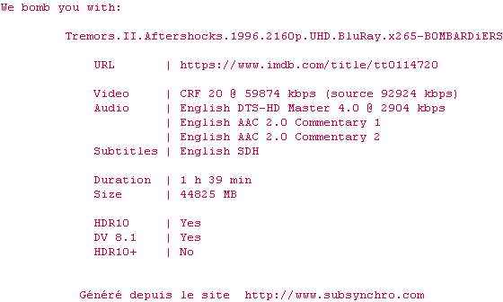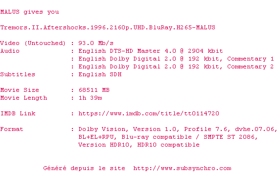 Voir le nfo de la release Tremors.II.Aftershocks.1996.2160p.UHD.BluRay.H265-MALUS