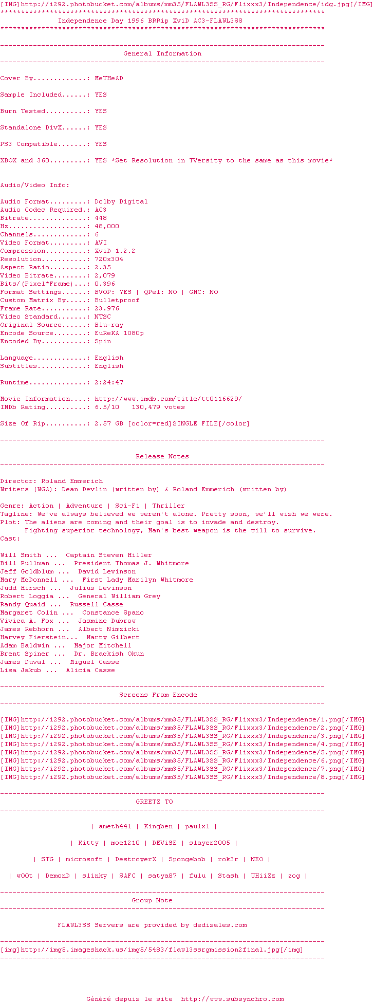 Telechargez le RSS « Fichier de la release Independence.Day.1996.BRRip.XviD.AC3-FLAWL3SS »