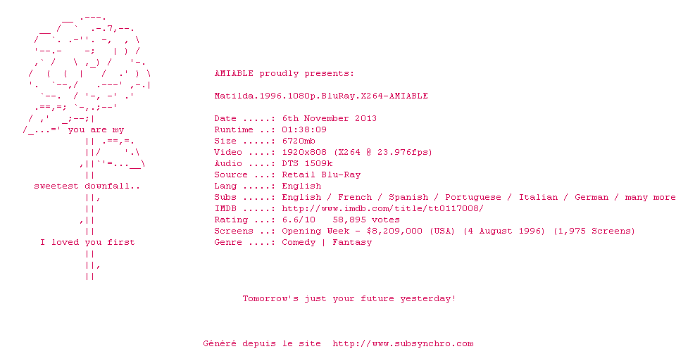 Telechargez le RSS « Fichier de la release Matilda.1996.1080p.BluRay.X264-AMIABLE »