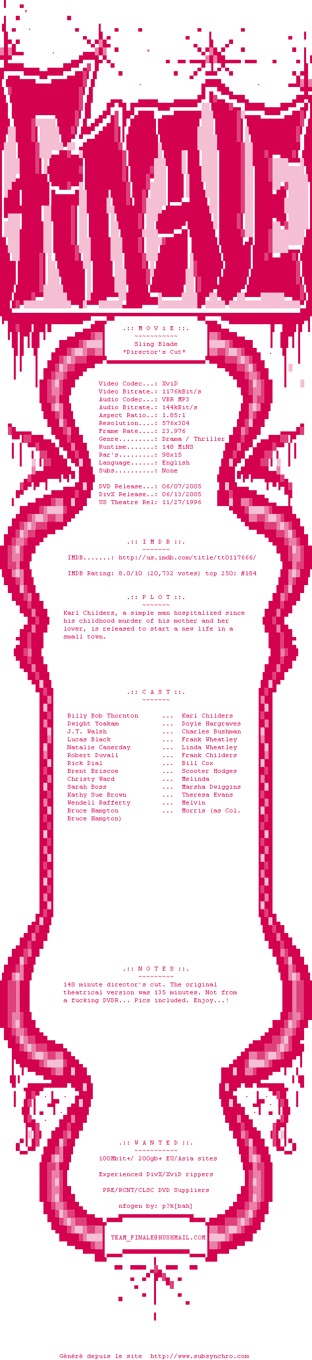 Y avez-vous pense ? Nous proposons déjà 5 sous-titres pour le film Sling Blade. Avez-vous essaye de voir si ces sous-titres etaient compatibles avec cette release ? On vous laisse le soin de tester cela pour nous et de contribuer au site en postant le sous-titre en cas de compatiblite constatee !