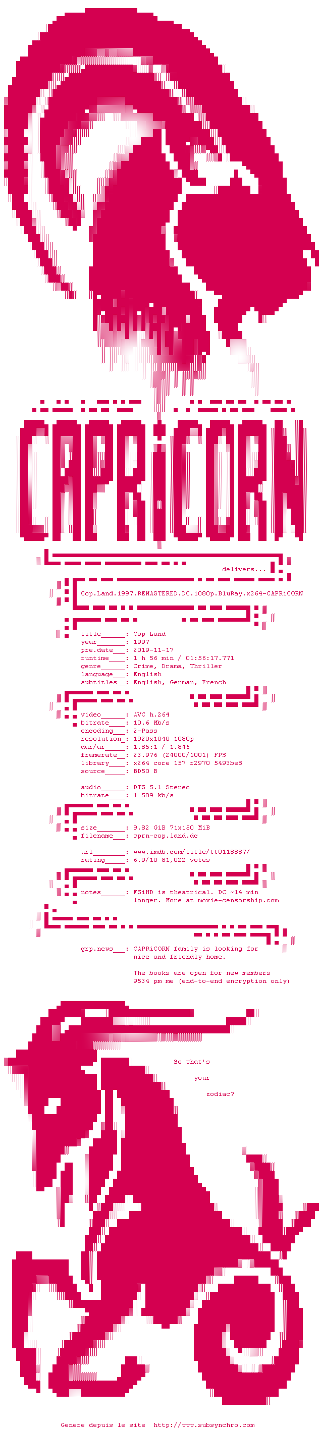 Voir le nfo de la release Cop.Land.1997.REMASTERED.THEATRiCAL.1080p.BluRay.x264-CAPRiCORN