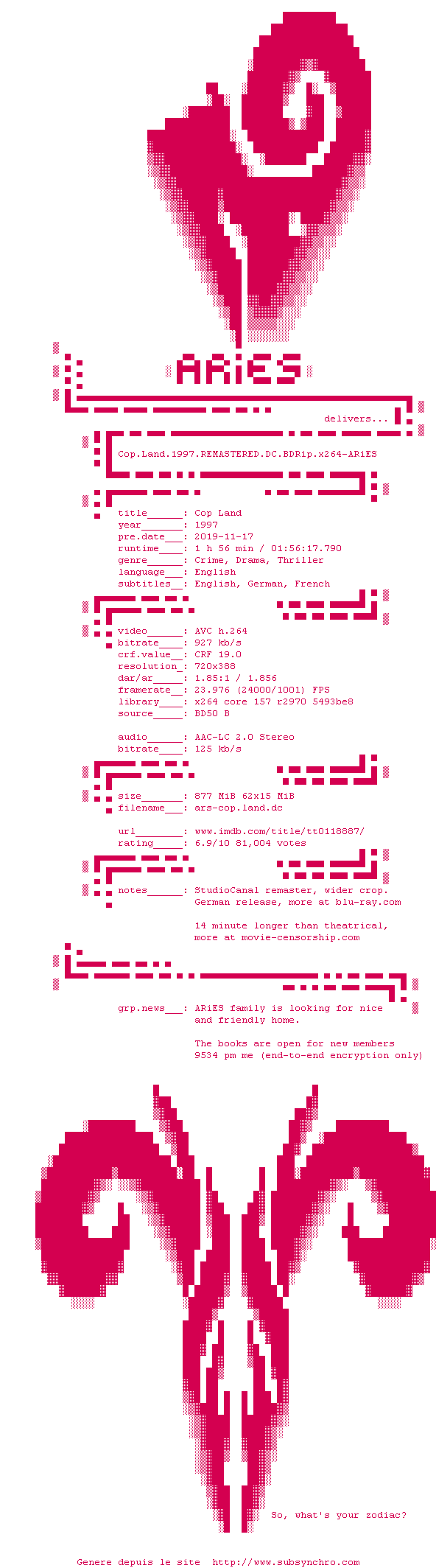 Voir le nfo de la release Cop.Land.1997.REMASTERED.THEATRiCAL.BDRip.x264-ARiES
