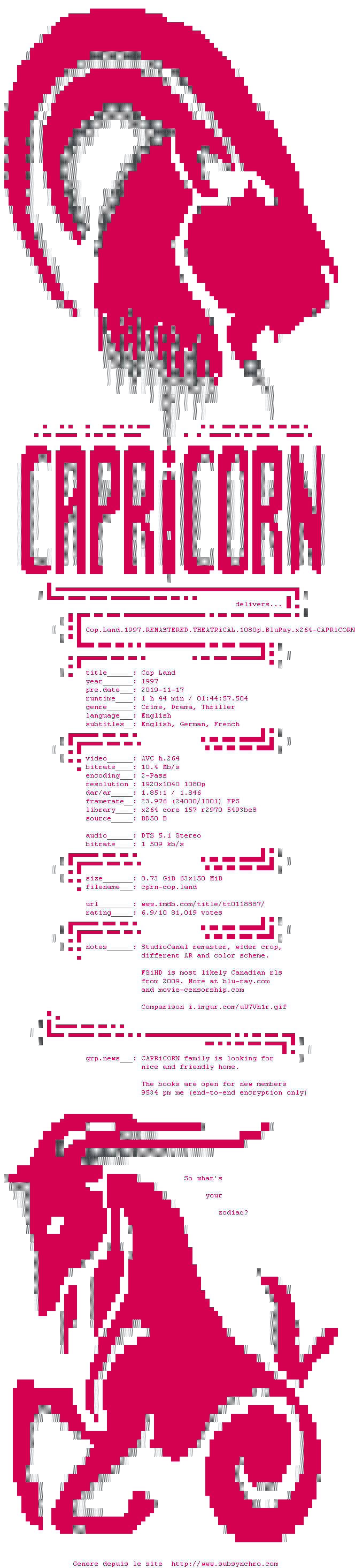 Voir le nfo de la release Cop.Land.1997.REMASTERED.DC.1080p.BluRay.x264-CAPRiCORN
