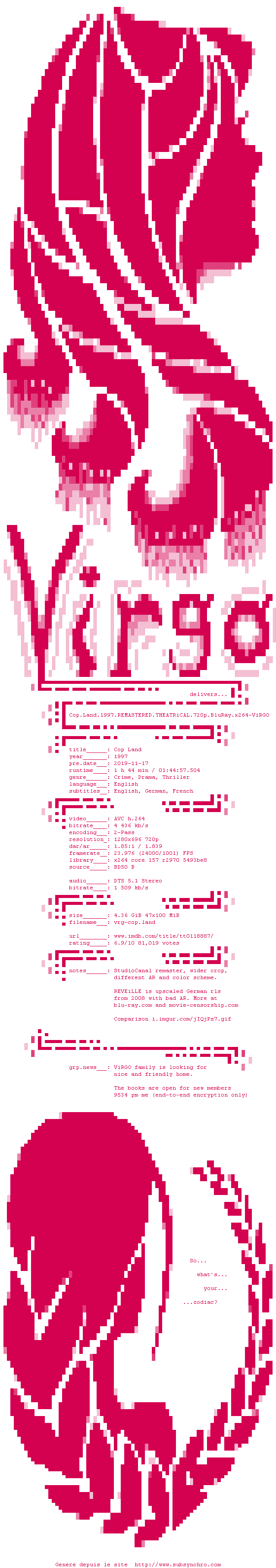 Voir le nfo de la release Cop.Land.1997.REMASTERED.THEATRiCAL.720p.BluRay.x264-ViRGO