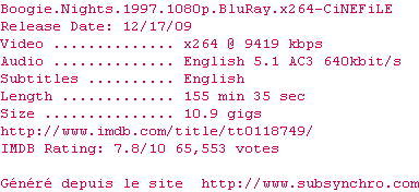Voir le nfo de la release Boogie.Nights.1997.1080p.BluRay.x264-CiNEFiLE