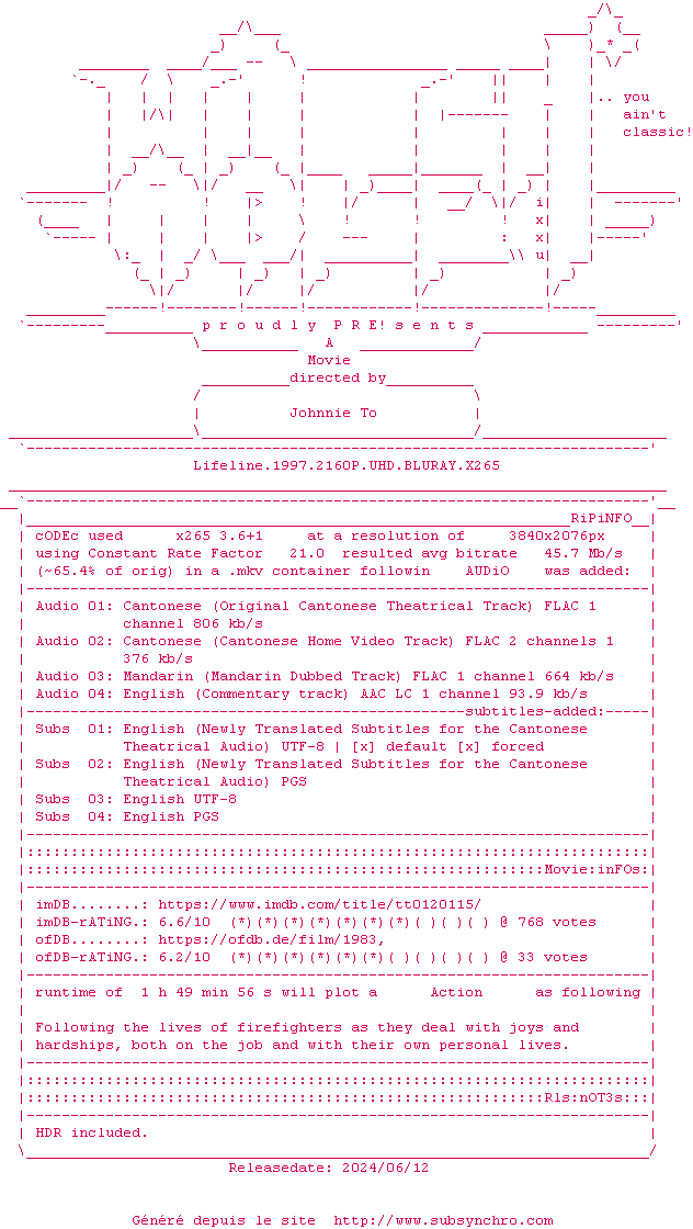 Voir le nfo de la release Lifeline.1997.2160P.UHD.BLURAY.H265-UNDERTAKERS