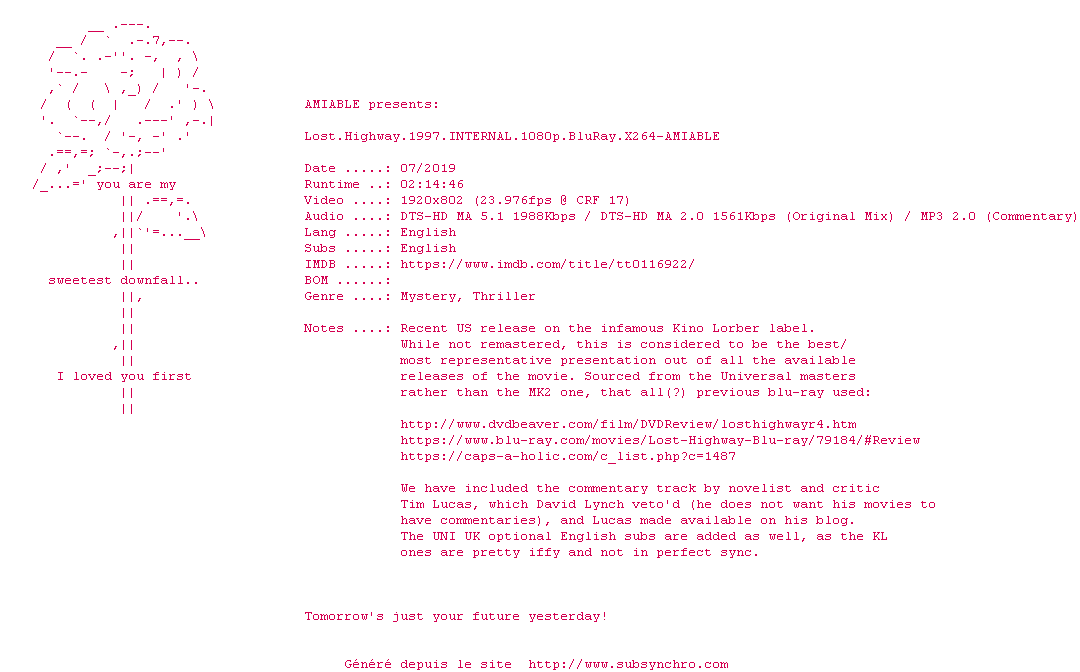 Voir le nfo de la release Lost.Highway.1997.iNTERNAL.1080p.BluRay.x264-AMIABLE