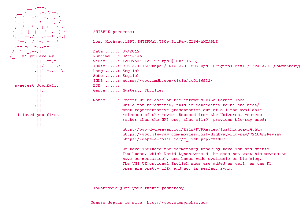Voir le nfo de la release Lost.Highway.1997.iNTERNAL.720p.BluRay.x264-AMIABLE