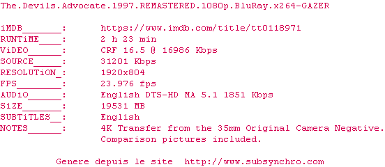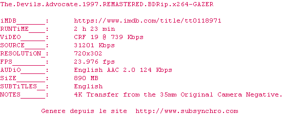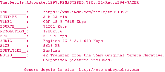 Un énorme classique, à voir une fois dans sa vie ! (au moins) Un Keanu pas chiant et impliqué, un Pacino au sommet de sa forme et une pauvre Charlize névrosée, le tout servi dans une bande-son fantastique et une mise en scène de la maîtrise absolue. Voyez-le !
