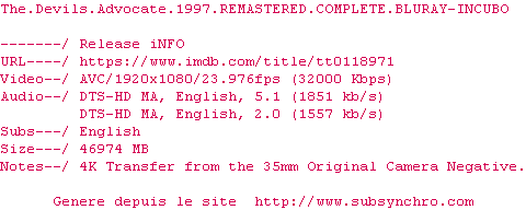 Le commentaire de Takuandaichi Commente par Takuandaichi (49), Le Vendredi 13 Mai 2016 à 20h30 Un énorme classique, à voir une fois dans sa vie ! (au moins) Un Keanu pas chiant et impliqué, un Pacino au sommet de sa forme et une pauvre Charlize névrosée, le tout servi dans une bande-son fantastique et une mise en scène de la maîtrise absolue. Voyez-le ! 10 / 10 1 0