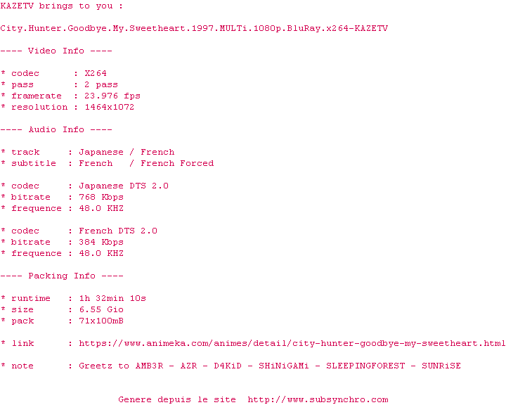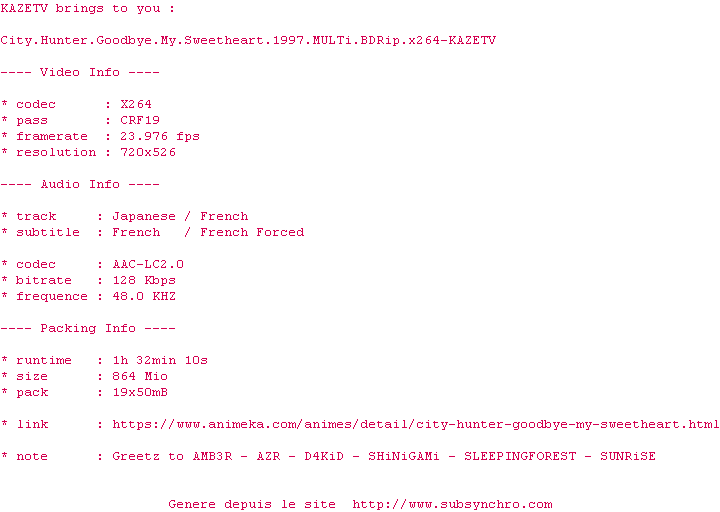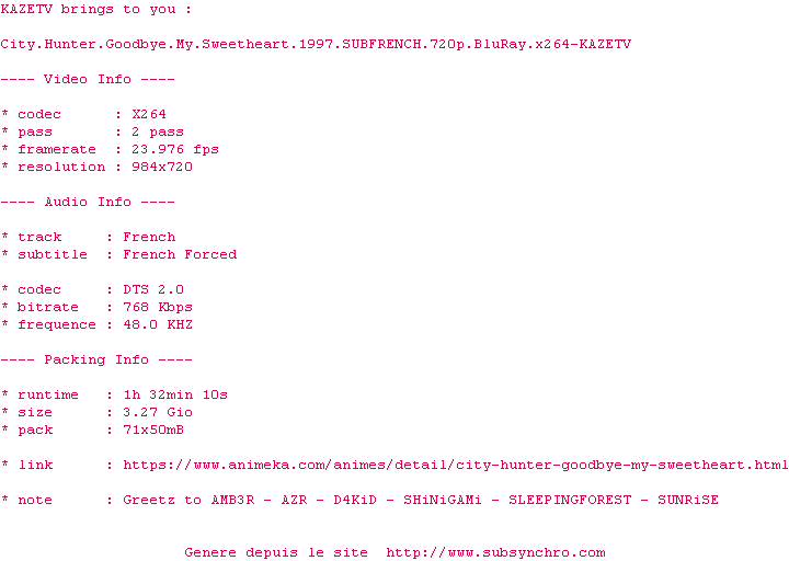 Voir le nfo de la release City.Hunter.Goodbye.My.Sweetheart.1997.SUBFRENCH.720p.BluRay.x264-KAZETV