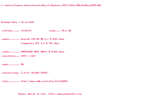 Voir le nfo de la release Austin.Powers.International.Man.Of.Mystery.1997.2160p.UHD.BluRay.x265-4KDVS