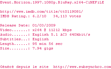 2047. Le vaisseau spatial "Lewis & Clark" s'apprète à regagner sa base quand l'équipage reçoit l'ordre de gagner la station Daylight pour embarquer le physicien William Weir, avec lequel il doit repartir en direction de Neptune. Quelques années plus tôt, Weir avait conçu un engin spatial révolutionnaire capable de se déplacer plus vite que la lumière mais qui disparut corps et biens aux abords de Neptune. La mission du "Lewis & Clark" consiste à repérer l'epave de l'"Event Horizon", à déceler les causes de sa mysterieuse avarie et à récuperer les éventuels survivants.