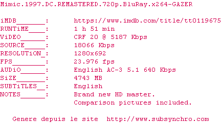Y avez-vous pense ? Nous proposons déjà 1197 sous-titres pour le film Mimic. Avez-vous essaye de voir si ces sous-titres etaient compatibles avec cette release ? On vous laisse le soin de tester cela pour nous et de contribuer au site en postant le sous-titre en cas de compatiblite constatee !