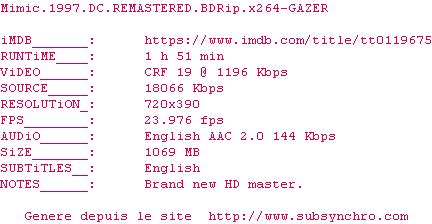 Y avez-vous pense ? Nous proposons déjà 1197 sous-titres pour le film Mimic. Avez-vous essaye de voir si ces sous-titres etaient compatibles avec cette release ? On vous laisse le soin de tester cela pour nous et de contribuer au site en postant le sous-titre en cas de compatiblite constatee !