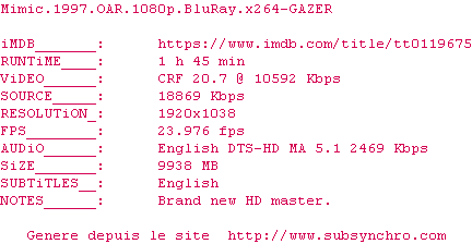 Y avez-vous pense ? Nous proposons déjà 1197 sous-titres pour le film Mimic. Avez-vous essaye de voir si ces sous-titres etaient compatibles avec cette release ? On vous laisse le soin de tester cela pour nous et de contribuer au site en postant le sous-titre en cas de compatiblite constatee !