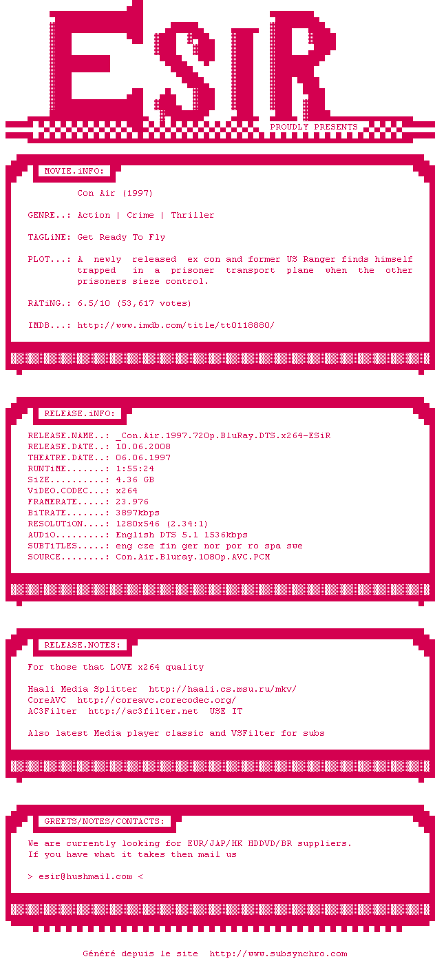 Voir le nfo de la release Con.Air.1997.720p.BluRay.DTS.x264-ESiR