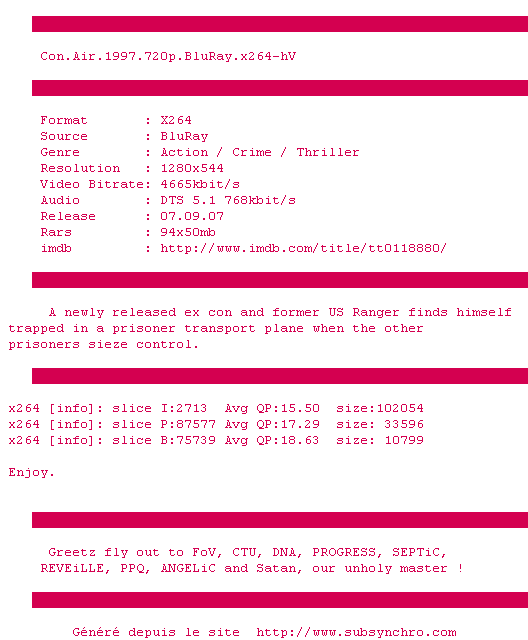 Voir le nfo de la release Con.Air.1997.720p.BluRay.x264-hV