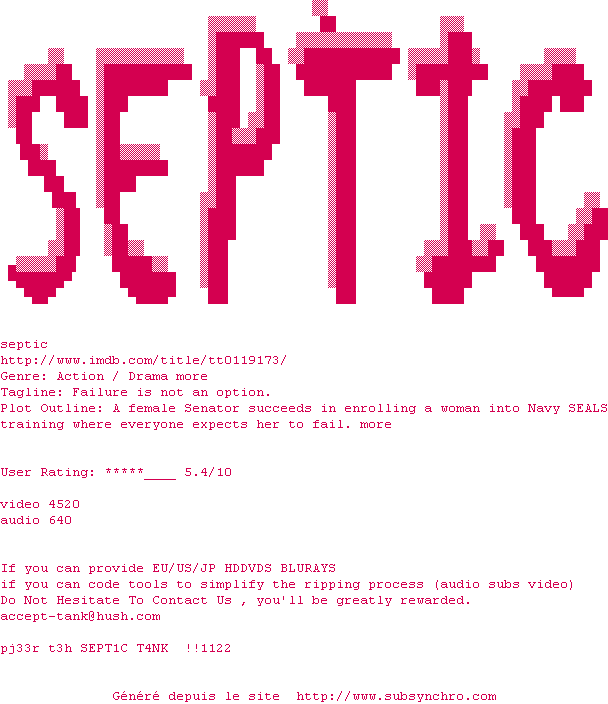 | Voir le nfo de la release Gi.Jane.1997.720p.BluRay.x264-SEPTiC | SEPTiC | Gi.Jane.1997.720p.BluRay.x264-SEPTiC OpenSubtitles | 0 fichier | ||