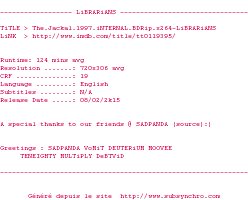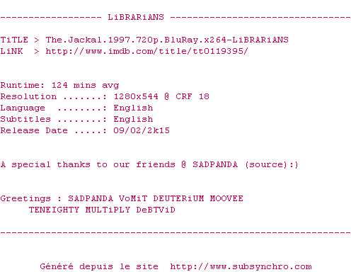 Voir le nfo de la release The.Jackal.1997.iNTERNAL.720p.BluRay.x264-LiBRARiANS