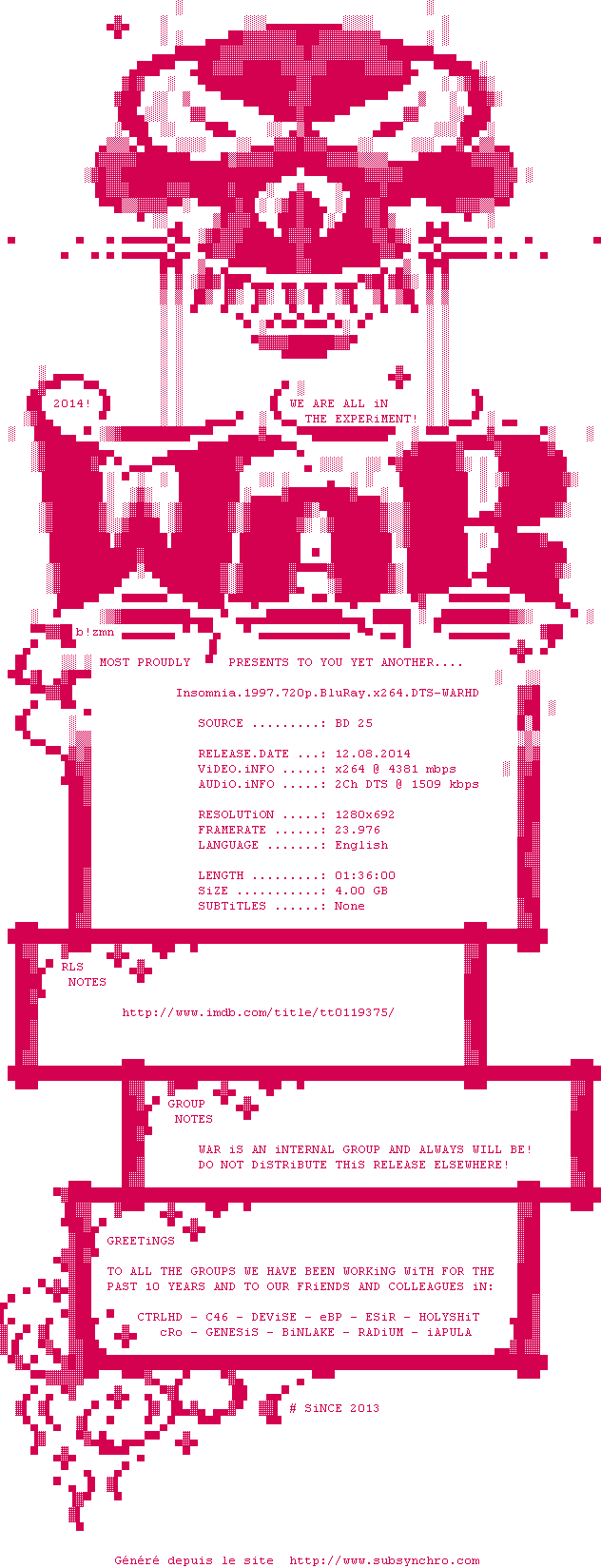 Voir le nfo de la release Insomnia.1997.720p.BluRay.x264.DTS-WARHD