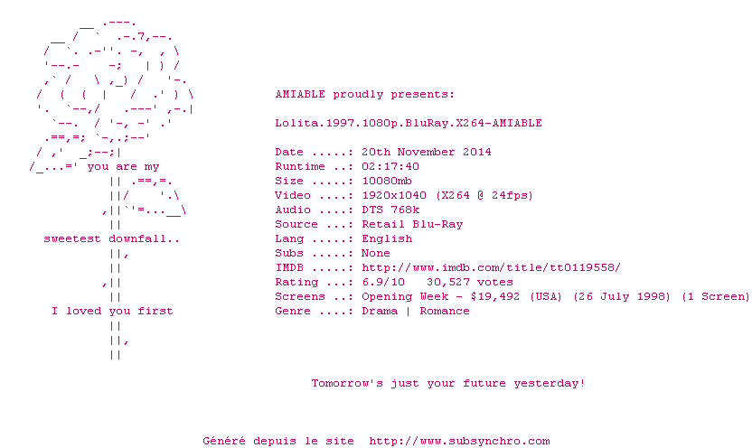 | Voir le nfo de la release Lolita.1997.1080p.BluRay.X264-AMIABLE | AMIABLE | Lolita.1997.1080p.BluRay.X264-AMIABLE OpenSubtitles | 0 fichier | ||