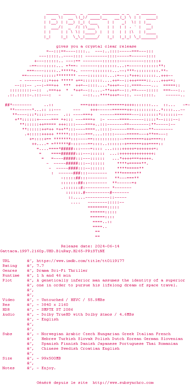 Voir le nfo de la release Gattaca.1997.2160p.UHD.BluRay.H265-PRiSTiNE