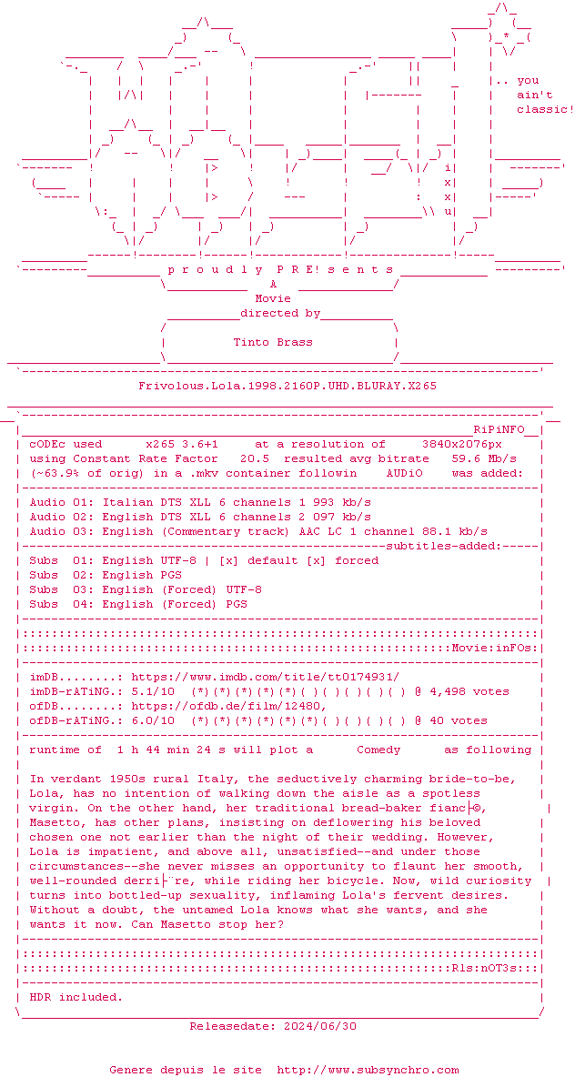 Voir le nfo de la release Frivolous.Lola.1998.2160P.UHD.BLURAY.x265-WATCHABLE