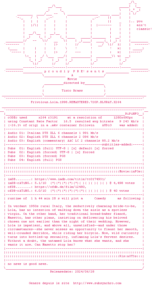 Voir le nfo de la release Frivolous.Lola.1998.REMASTERED.1080P.BLURAY.x264-WATCHABLE