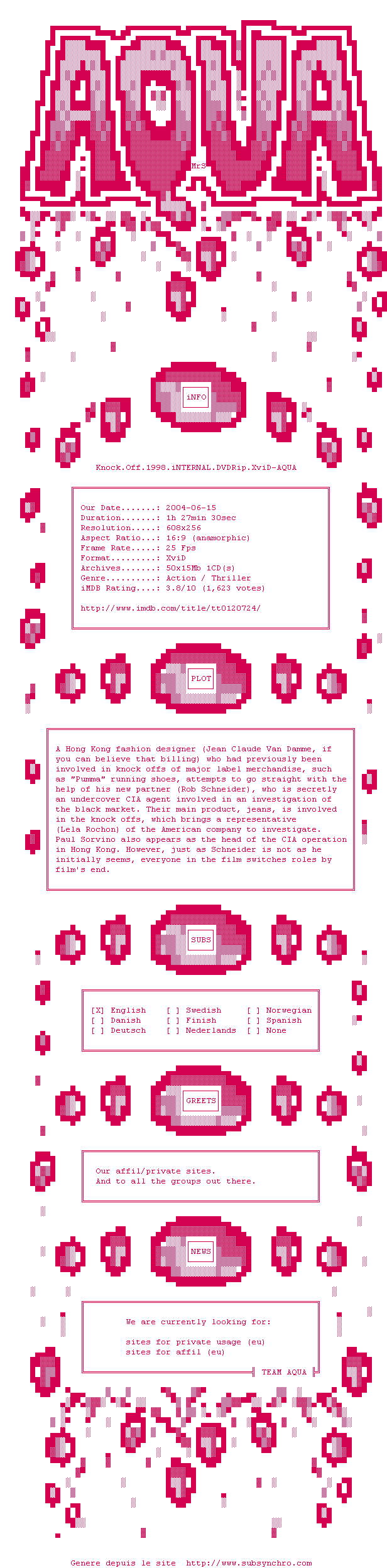 Y avez-vous pense ? Nous proposons déjà 2 sous-titres pour le film Piège à Hong Kong. Avez-vous essaye de voir si ces sous-titres etaient compatibles avec cette release ? On vous laisse le soin de tester cela pour nous et de contribuer au site en postant le sous-titre en cas de compatiblite constatee !
