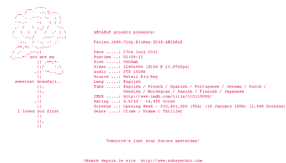 Voir le nfo de la release Fallen.1998.1080p.BluRay.X264-AMIABLE