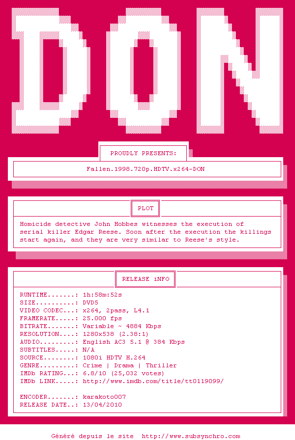 Voir le nfo de la release Fallen.1998.720p.HDTV.x264-DON