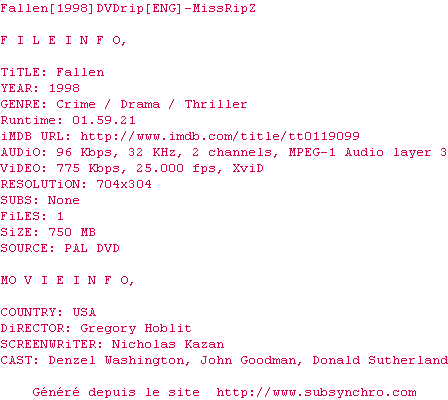 Voir le nfo de la release Fallen.1998.DVDrip-MissRipZ