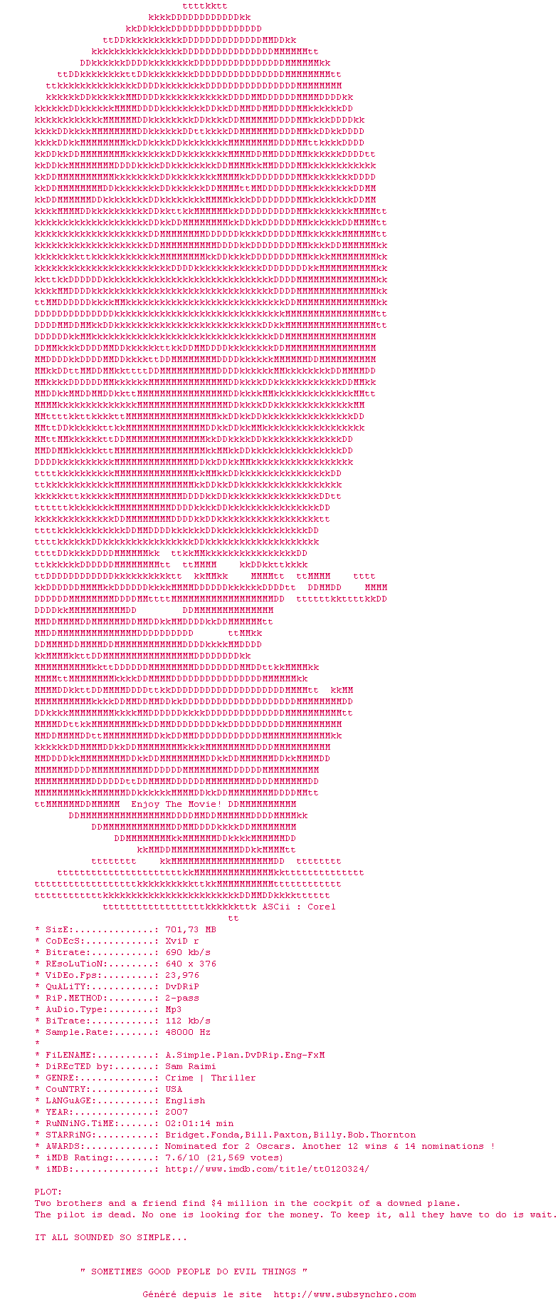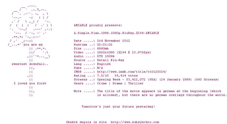 Voir le nfo de la release A.Simple.Plan.1998.1080p.BluRay.x264.AAC5.1-YTS