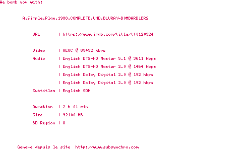 Voir le nfo de la release A.Simple.Plan.1998.2160p.UHD.BluRay.x265-B0MBARDiERS