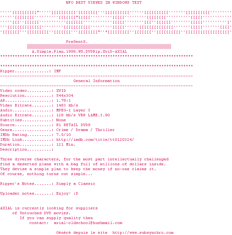 Voir le nfo de la release A.Simple.Plan.1998.WS.DVDRip.XviD-AXIAL