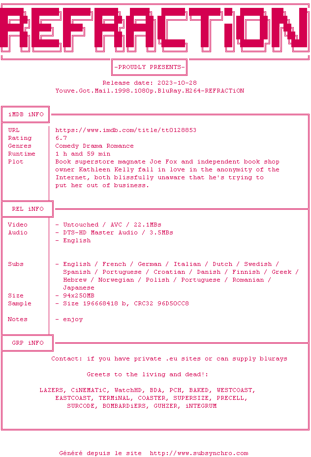 Voir le nfo de la release Youve.Got.Mail.1998.1080p.BluRay.H264-REFRACTiON