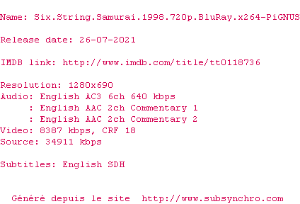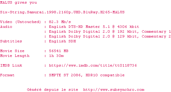 Voir le nfo de la release Six-String.Samurai.1998.2160p.UHD.BluRay.H265-MALUS