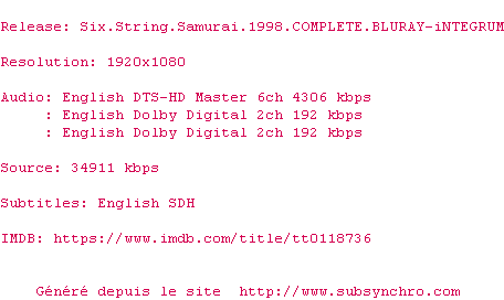 Voir le nfo de la release Six.String.Samurai.1998.COMPLETE.BLURAY-iNTEGRUM