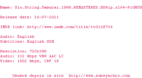 Voir le nfo de la release Six.String.Samurai.1998.REMASTERED.BDRip.x264-PiGNUS