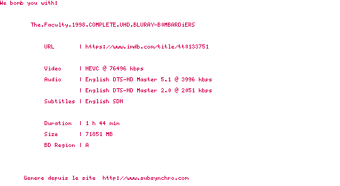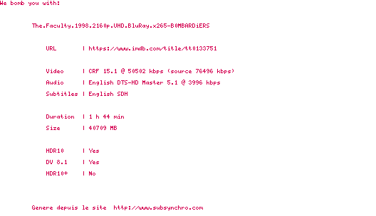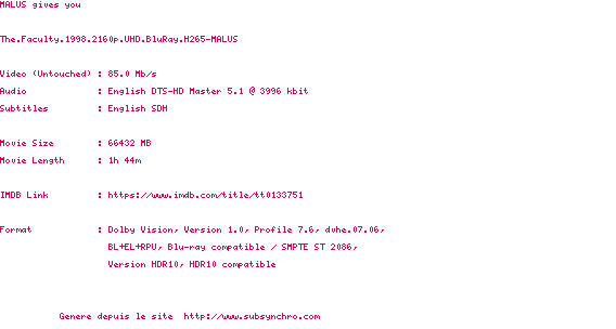 Voir le nfo de la release The.Faculty.1998.2160p.UHD.BluRay.H265-MALUS