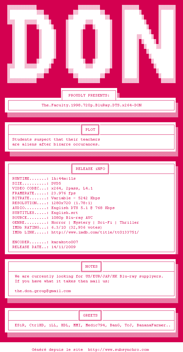 Voir le nfo de la release The.Faculty.1998.720p.BluRay.DTS.x264-DON