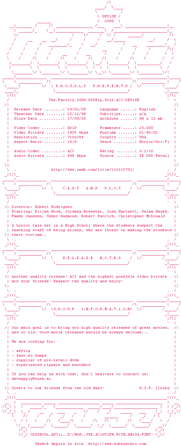 Voir le nfo de la release The.Faculty.1998.DVDRip.XviD.AC3-DEViSE