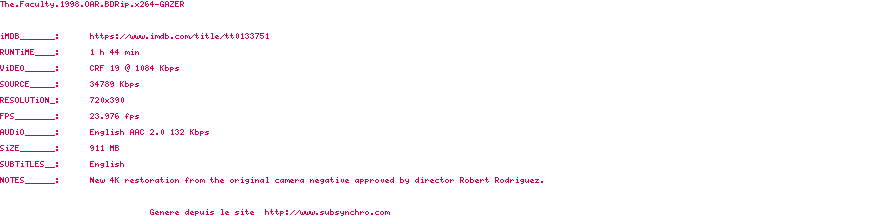 Voir le nfo de la release The.Faculty.1998.OAR.BDRip.x264-GAZER