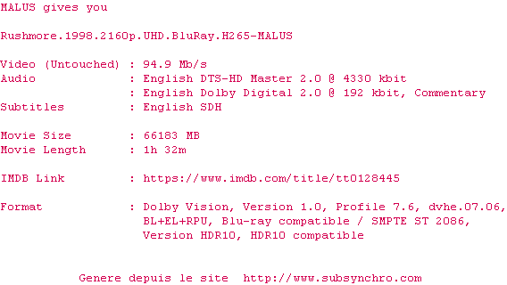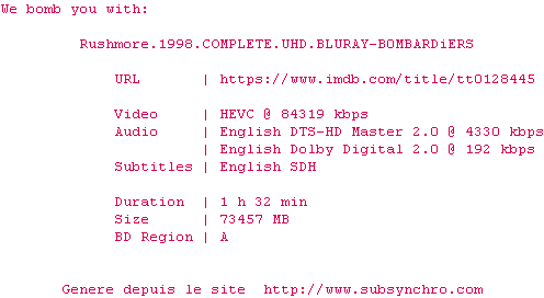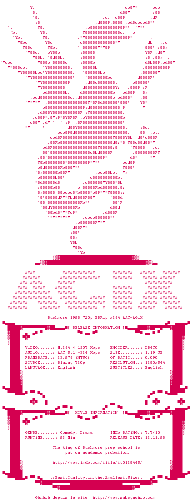Le commentaire de Nuclear Commente par Nuclear (397), Le Dimanche 03 Mars 2013 à 13h53 On suit sans déplaisir Rushmore, dont l'élégance révèle tout le talent de Wes Anderson, mais ses interminables longueurs finissent par exaspérer. 6 / 10 1 0